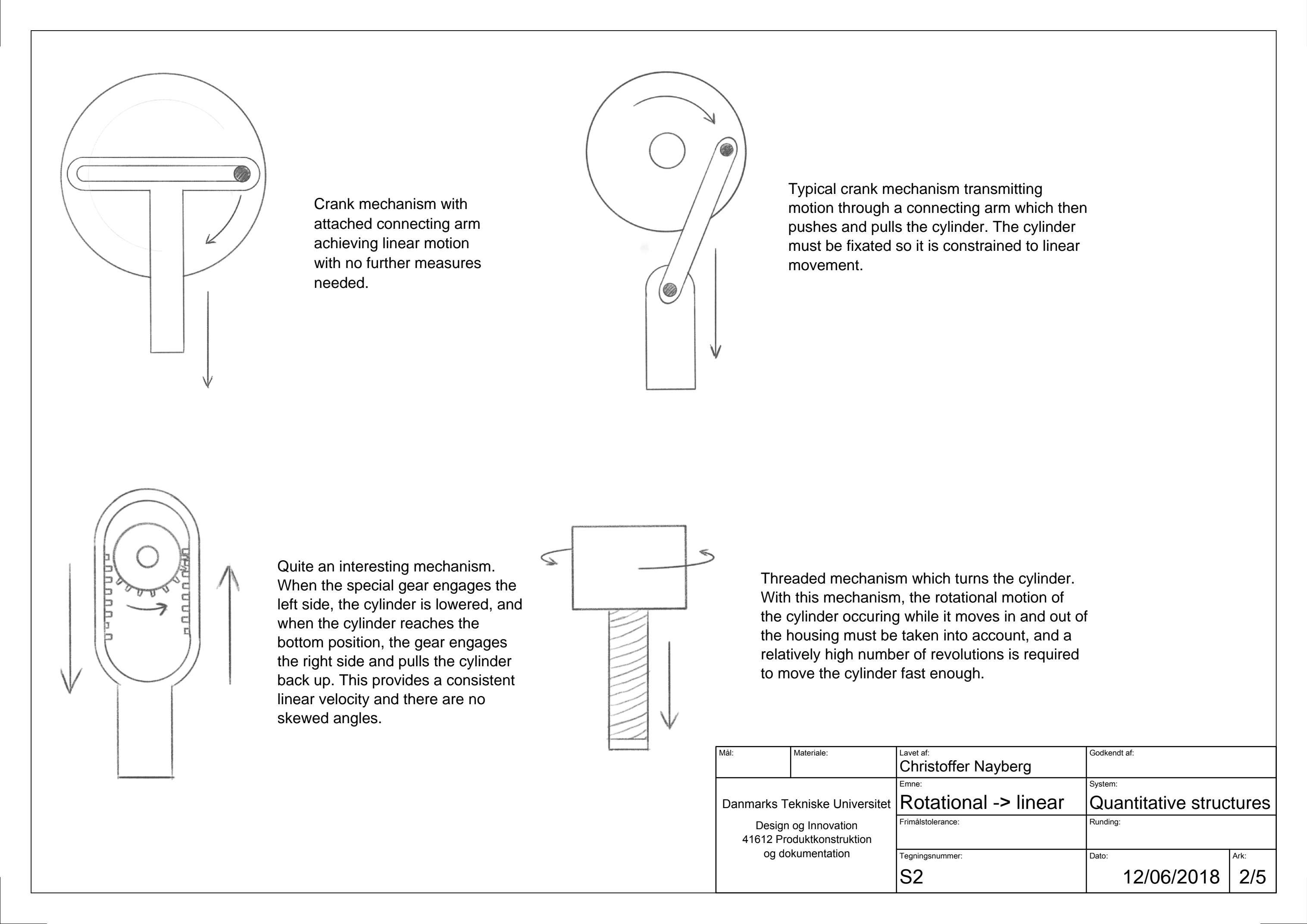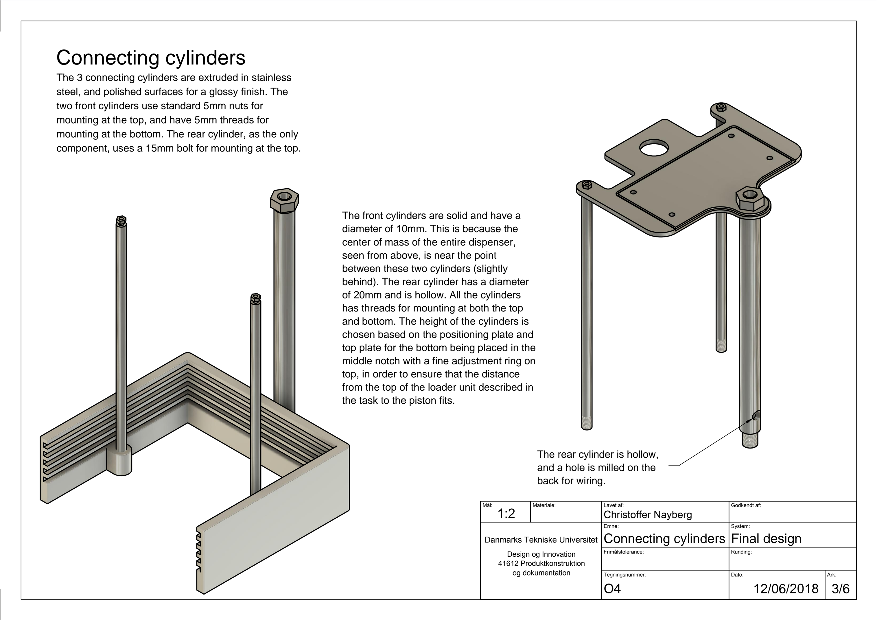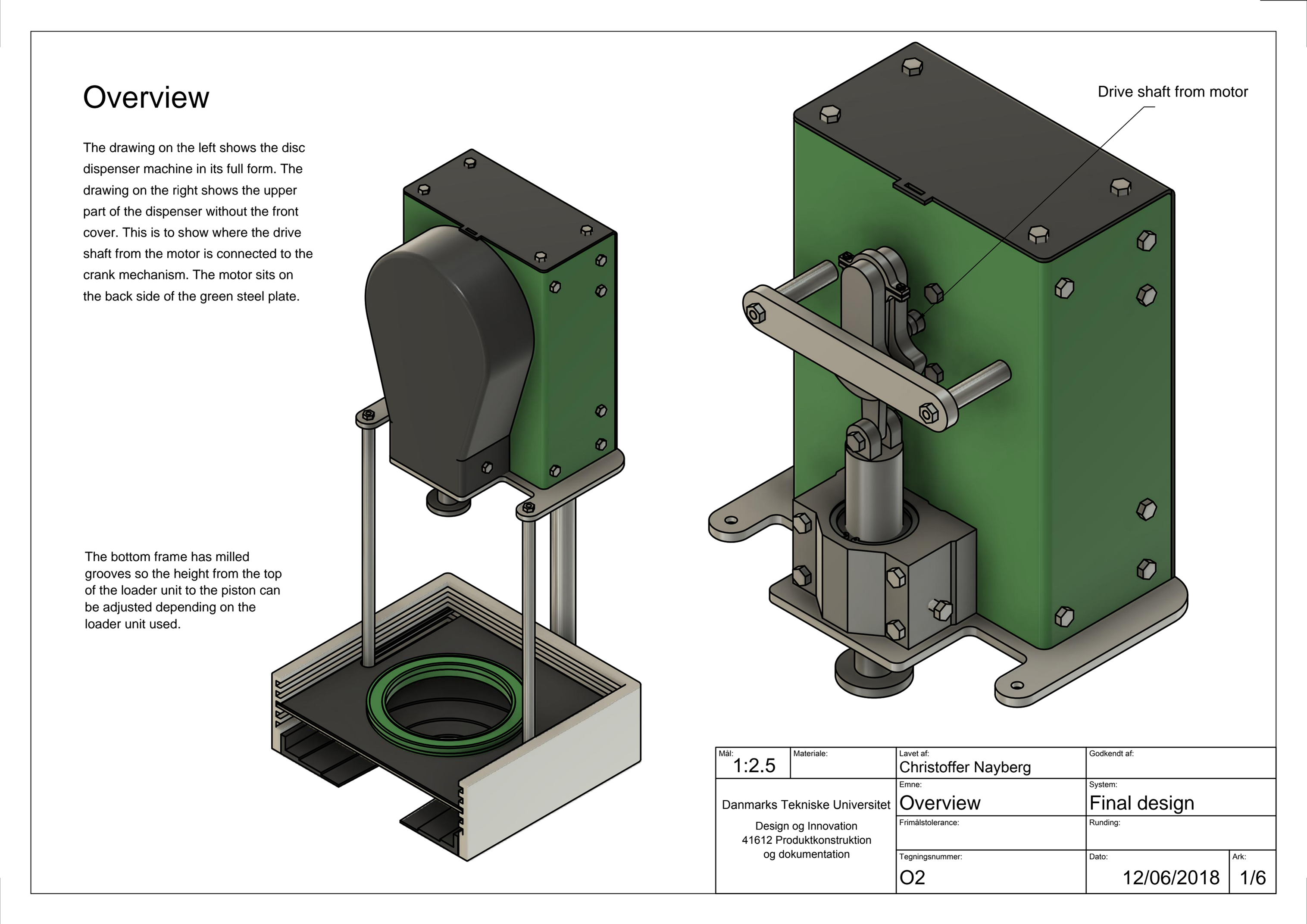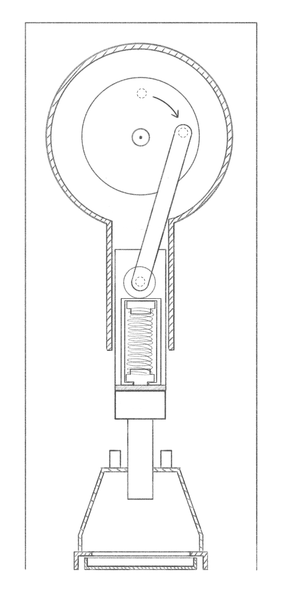 Concept 2 consists of a typical crank mechanism, the simple compression force limiter solution with a pre-tensioned spring, and a base stand including the petri dish plate for several sizes of petri dishes. There is no assembly of the loader unit, as it is placed on top of the stand, and the dispenser simply presses down on the top of the loader unit by means of a piston, which is connected to the cylinder through the spring.