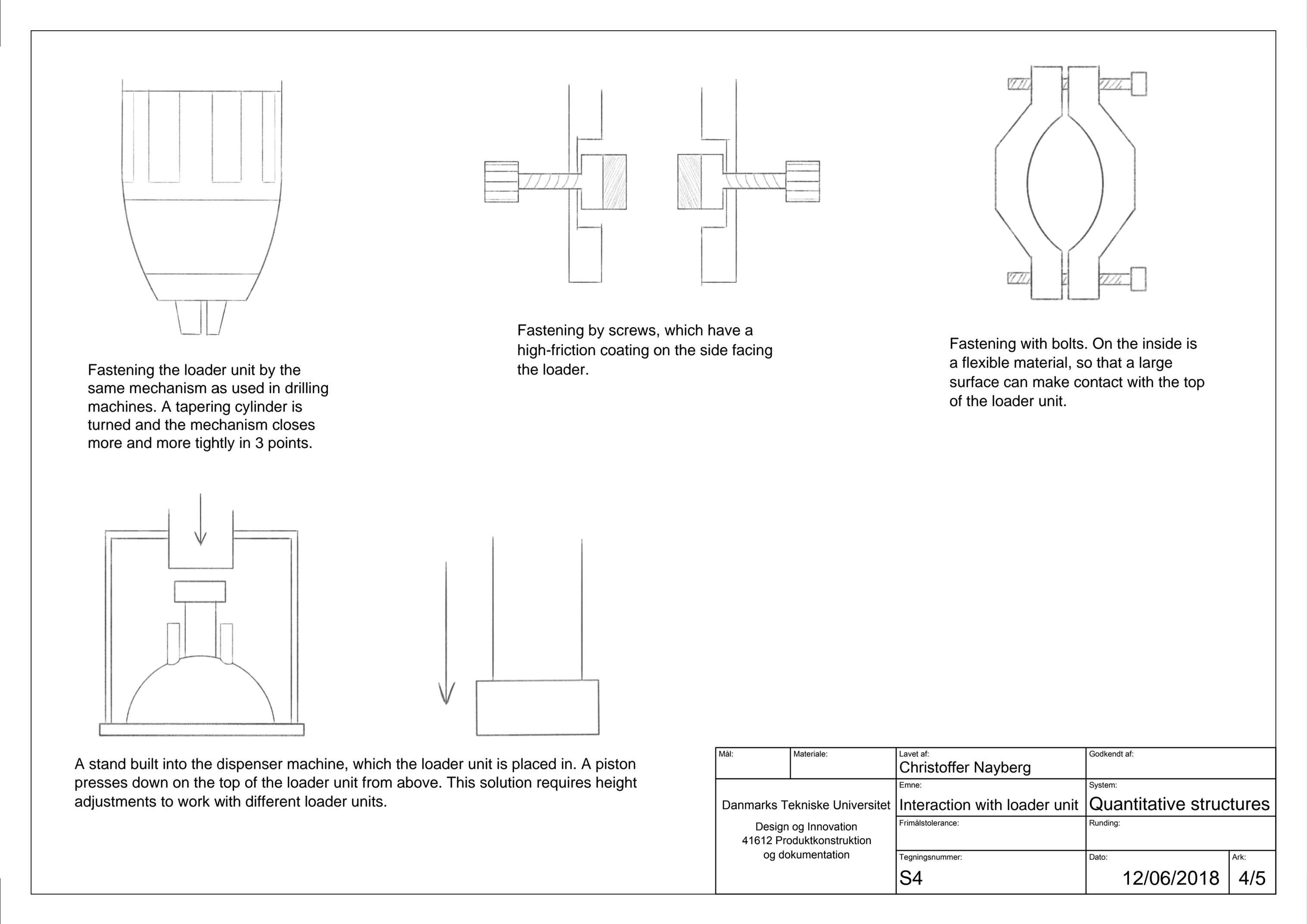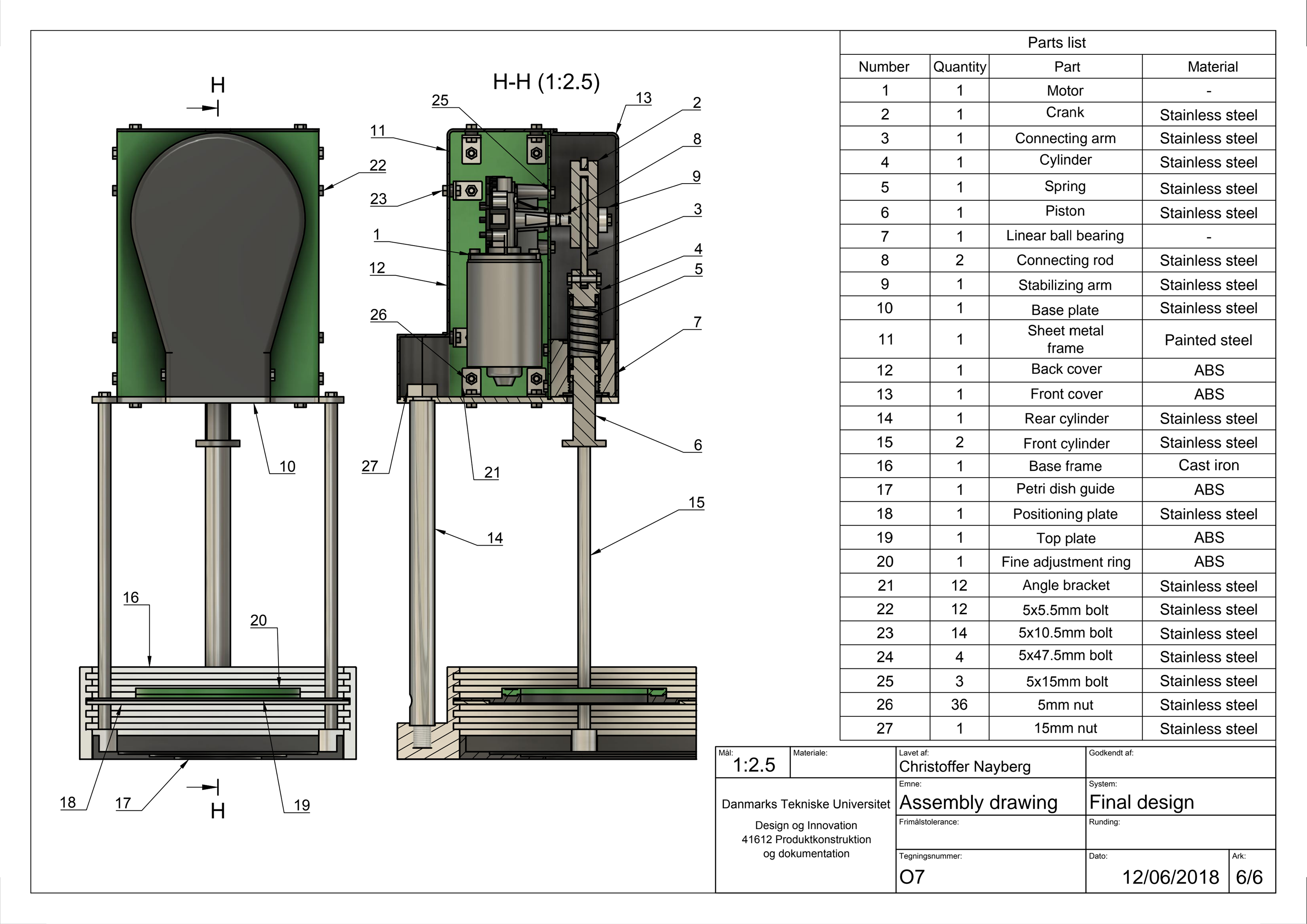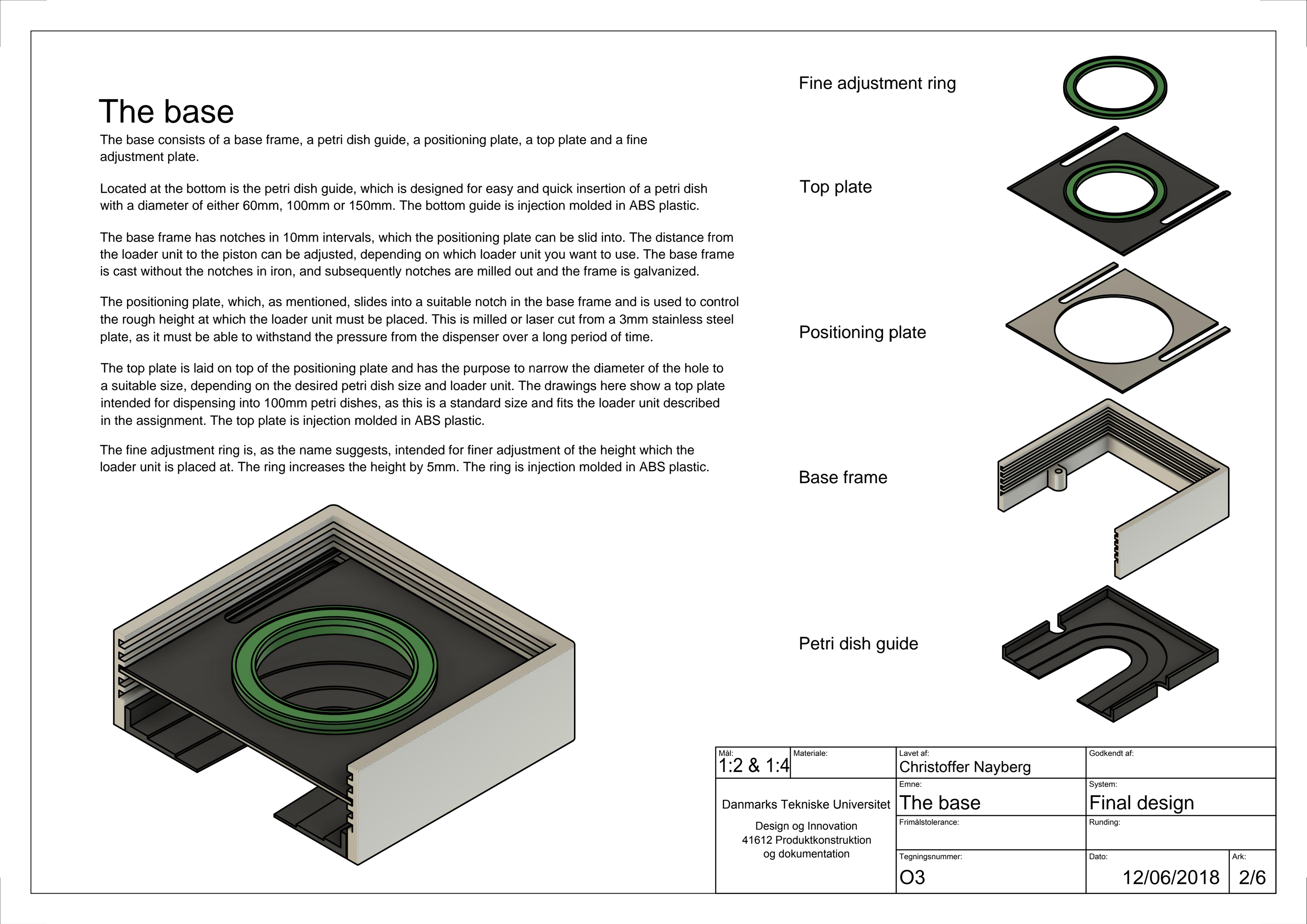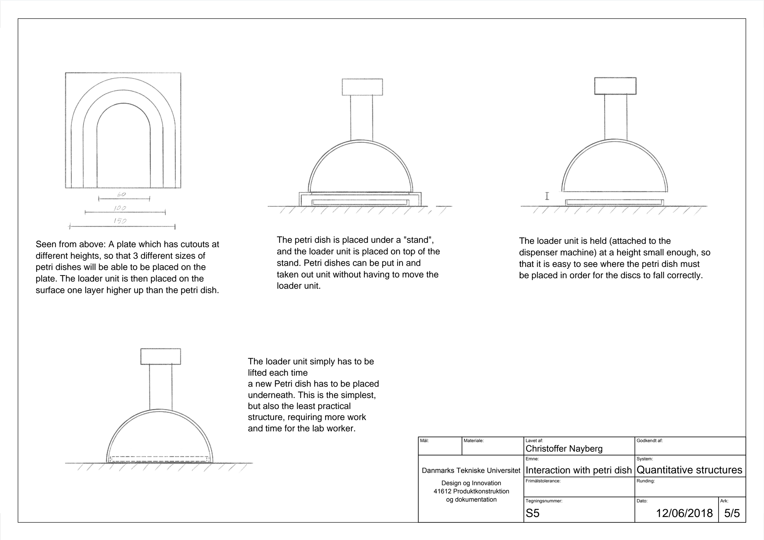 Concept 2 was selected for further development. Ease of use, mechanical simplicity and durability were prioritized over size of the product. The loader units as well as petri dishes can be quickly replaced and are easy to position, and the spring mechanism provides a certain flexibility in how precise the loader unit must be placed height-wise.