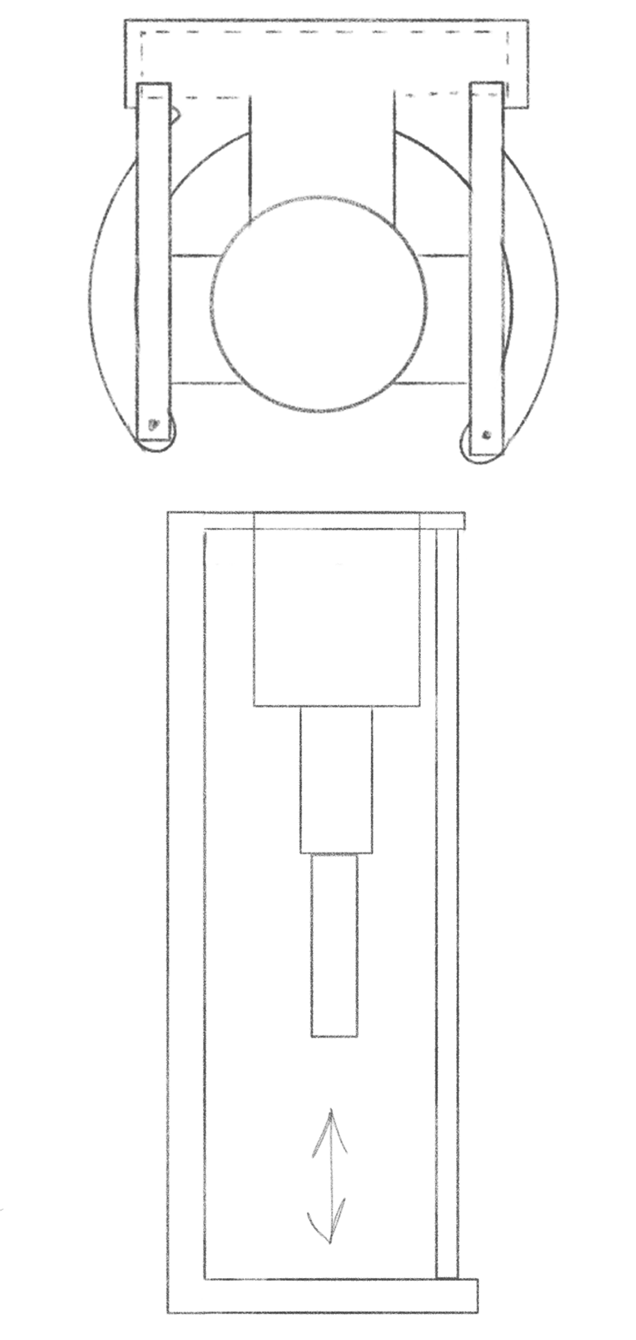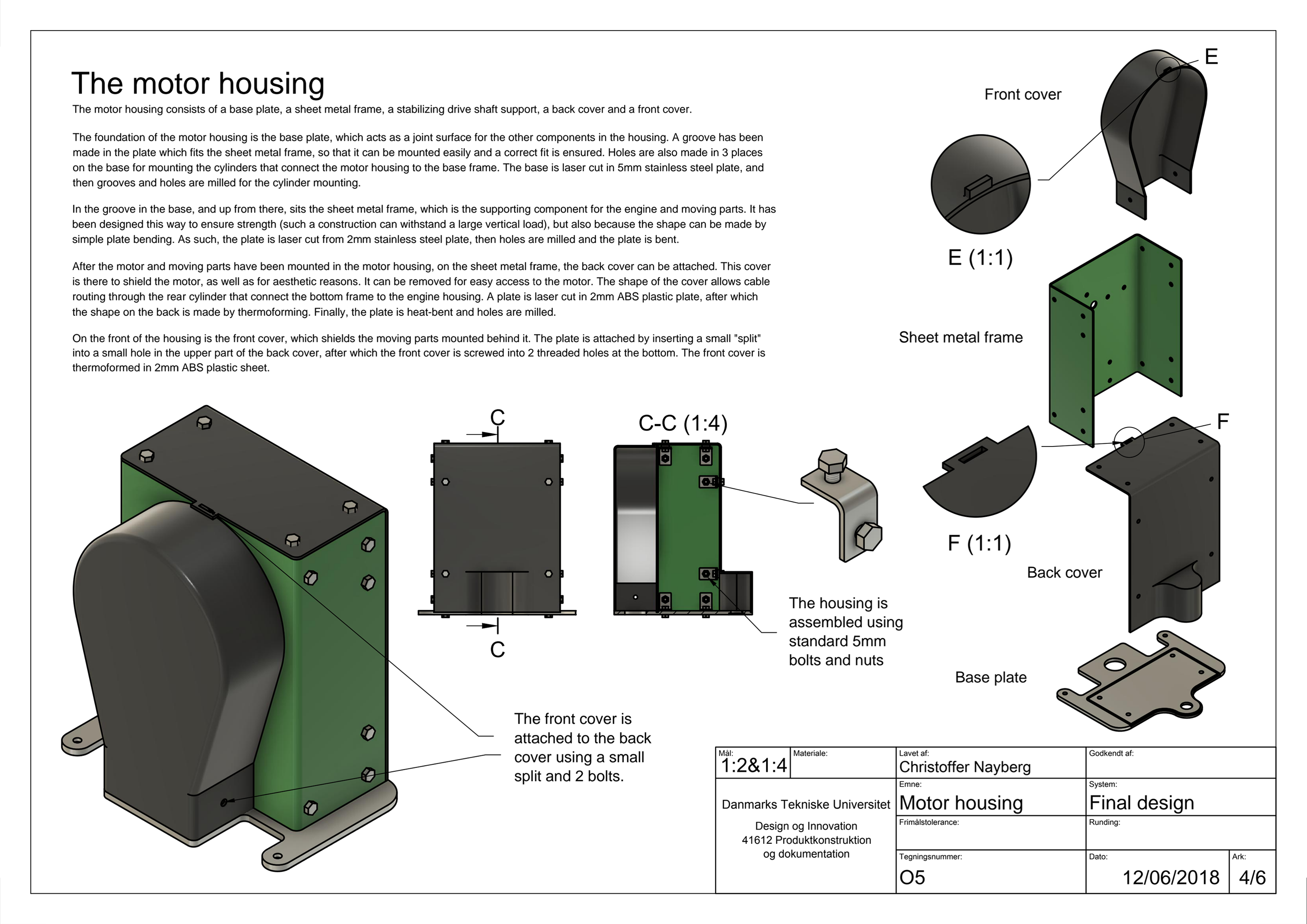 The rear cylinder is hollowed to allow for cabling to the motor, which is placed on the rear side of the front facing part of the steel sheet housing. The moving parts are located on the front side of the steel sheet housing, along with a stabilizing arm containing a bearing for the axle connected to the drive shaft.
