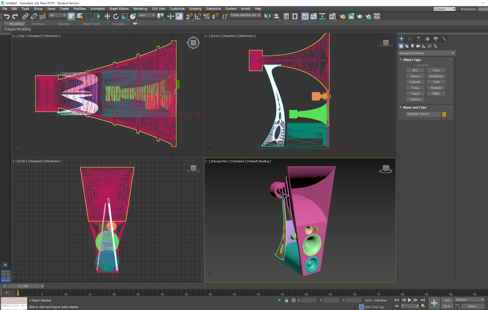 Modeling the large black horn structure presented several difficulties, since the front is shaped as a trapeze and the back as a rectangle combined with the curved top and bottom.