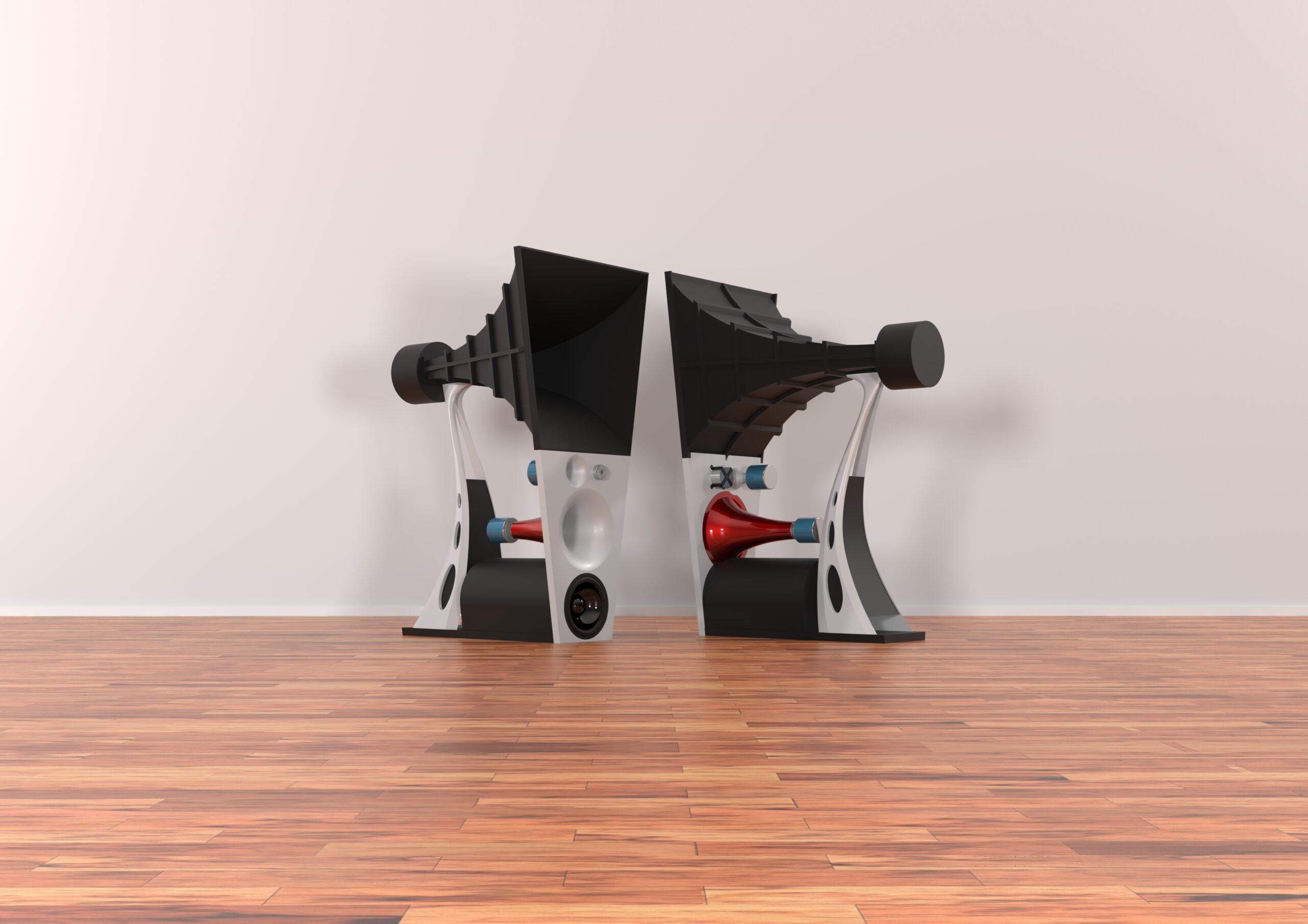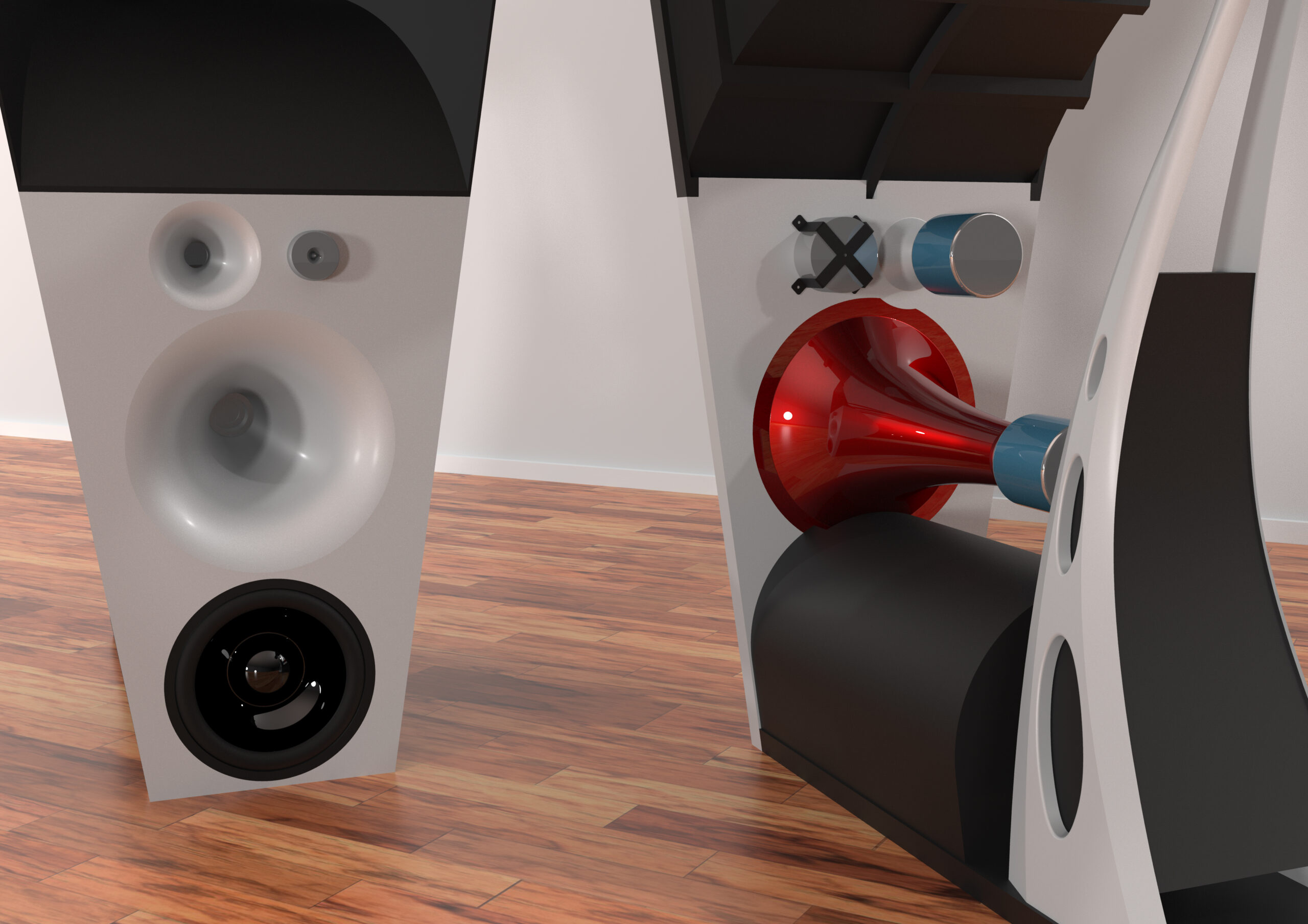 The speakers were modeled in PTC Creo, while materials, shading, ligthing and rendering was done in Autodesk 3D Studio Max.