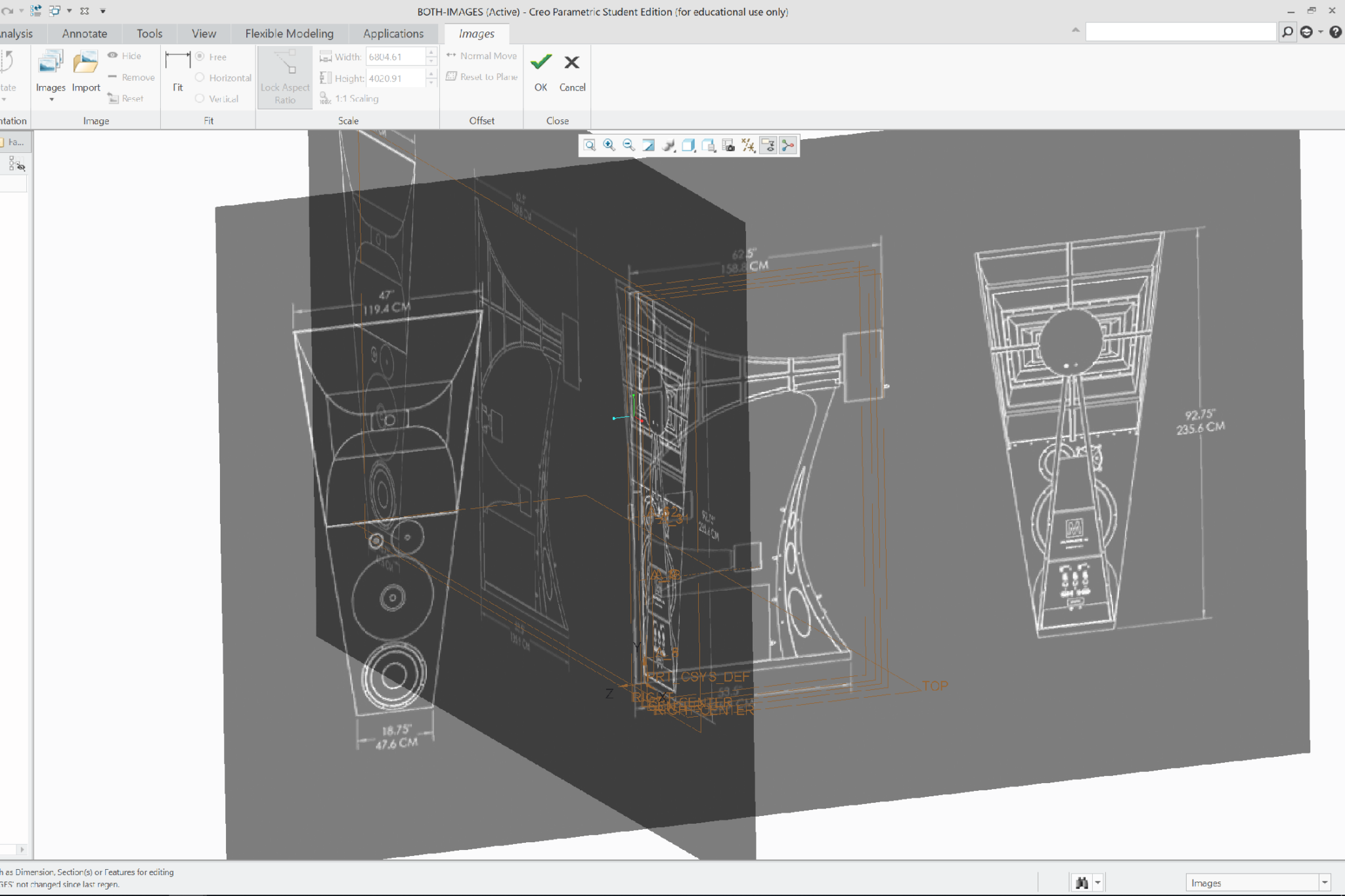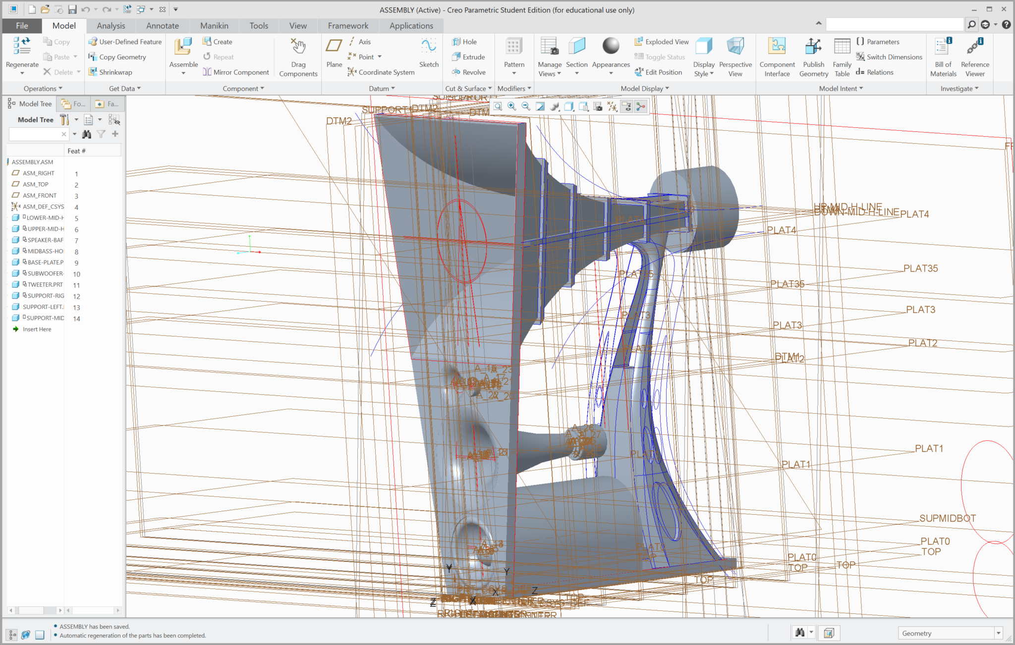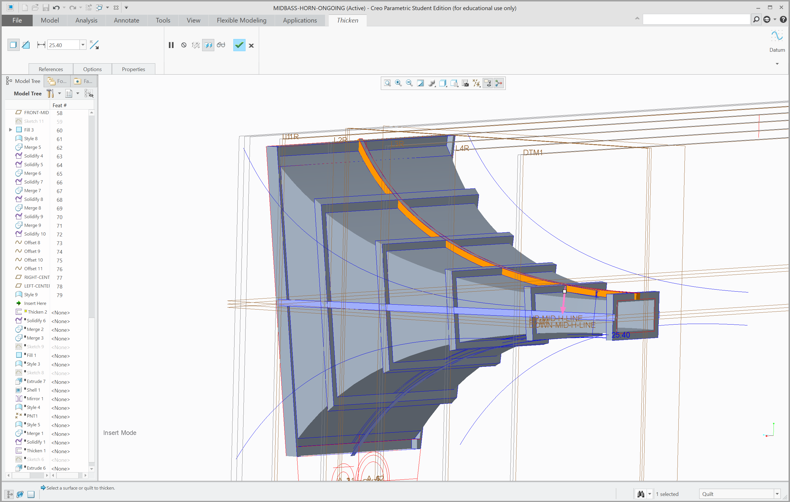 Two datum planes following the innermost and outermost surfaces of the component were first created. Then, curves following the outline of the component was drawn on a vertical datum plane, seen from the side of the speaker. Following this, multiple horizontal datum planes were created at different heights, on which the outline of the component was drawn, seen from above.