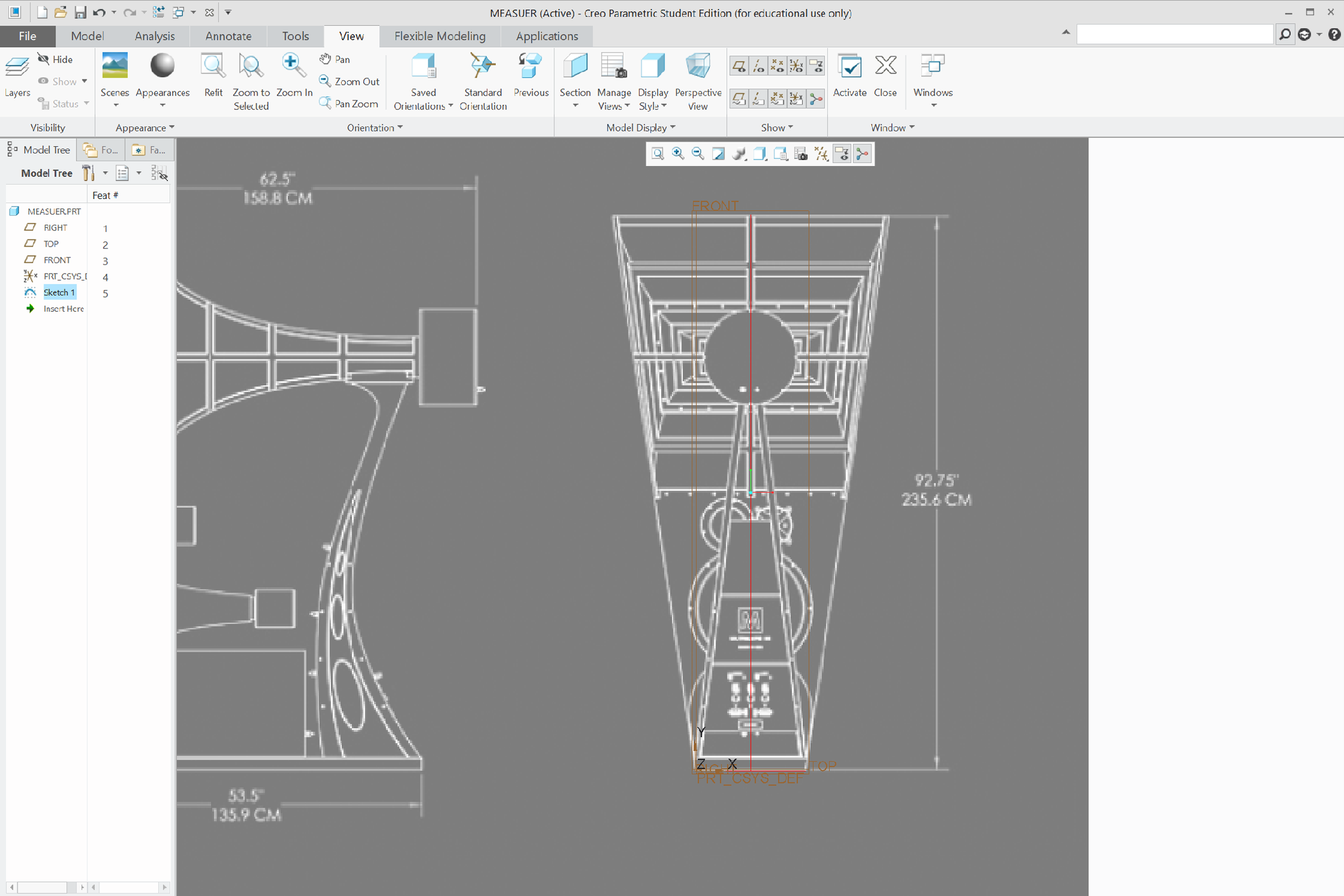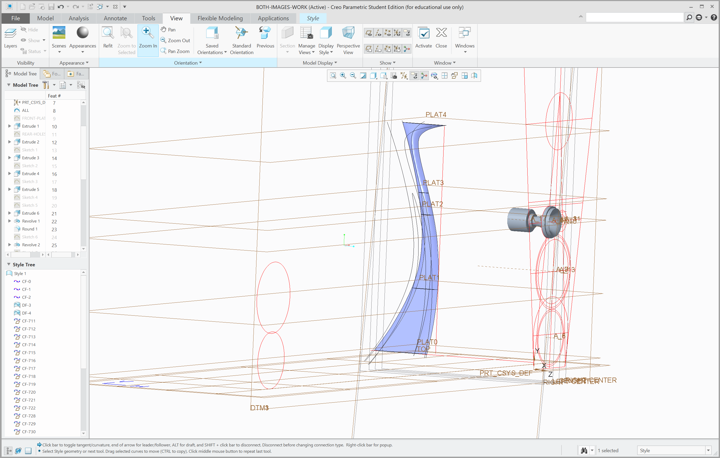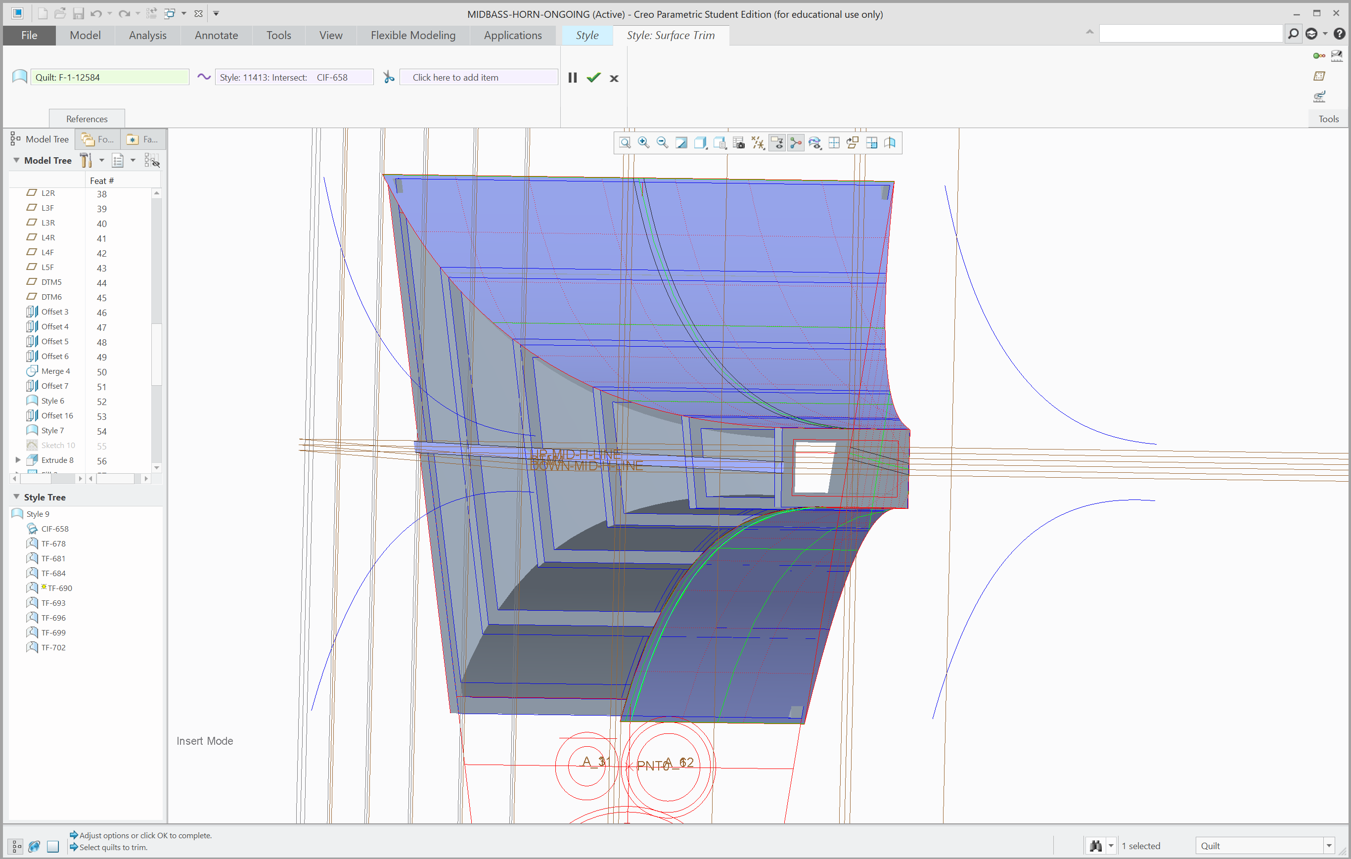 Two datum planes following the innermost and outermost surfaces of the component were first created. Then, curves following the outline of the component was drawn on a vertical datum plane, seen from the side of the speaker. Following this, multiple horizontal datum planes were created at different heights, on which the outline of the component was drawn, seen from above.