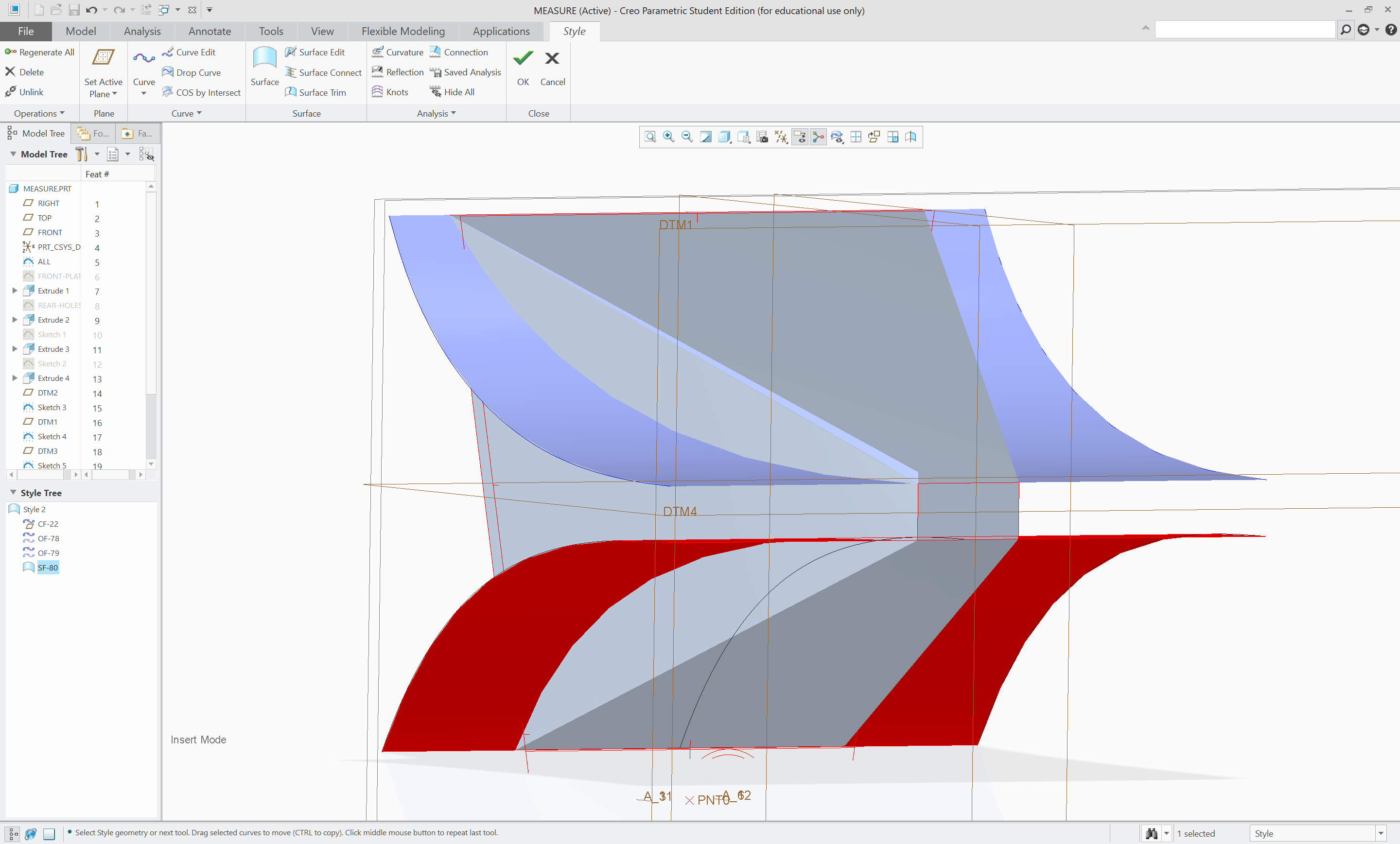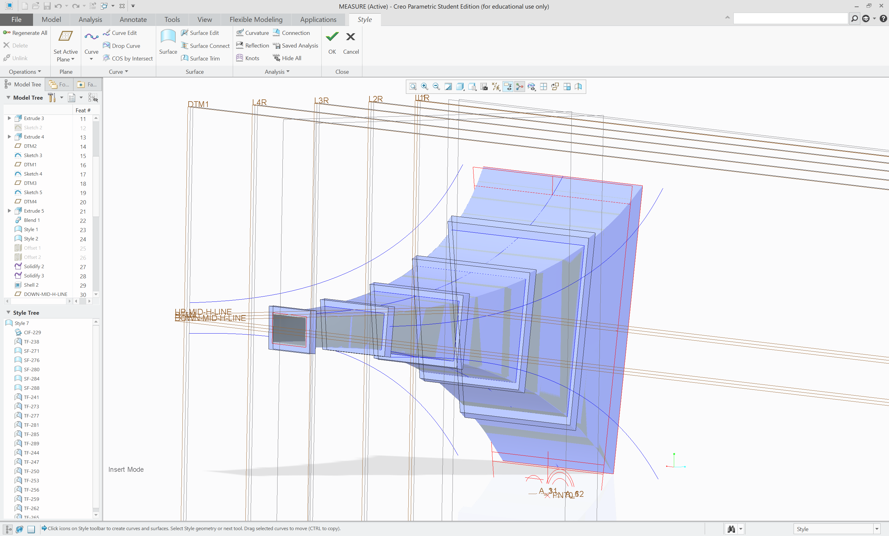 Finally, surfaces were created between all the curves using surface connect. Additional horizontal planes were necessary for a satisfactory result.