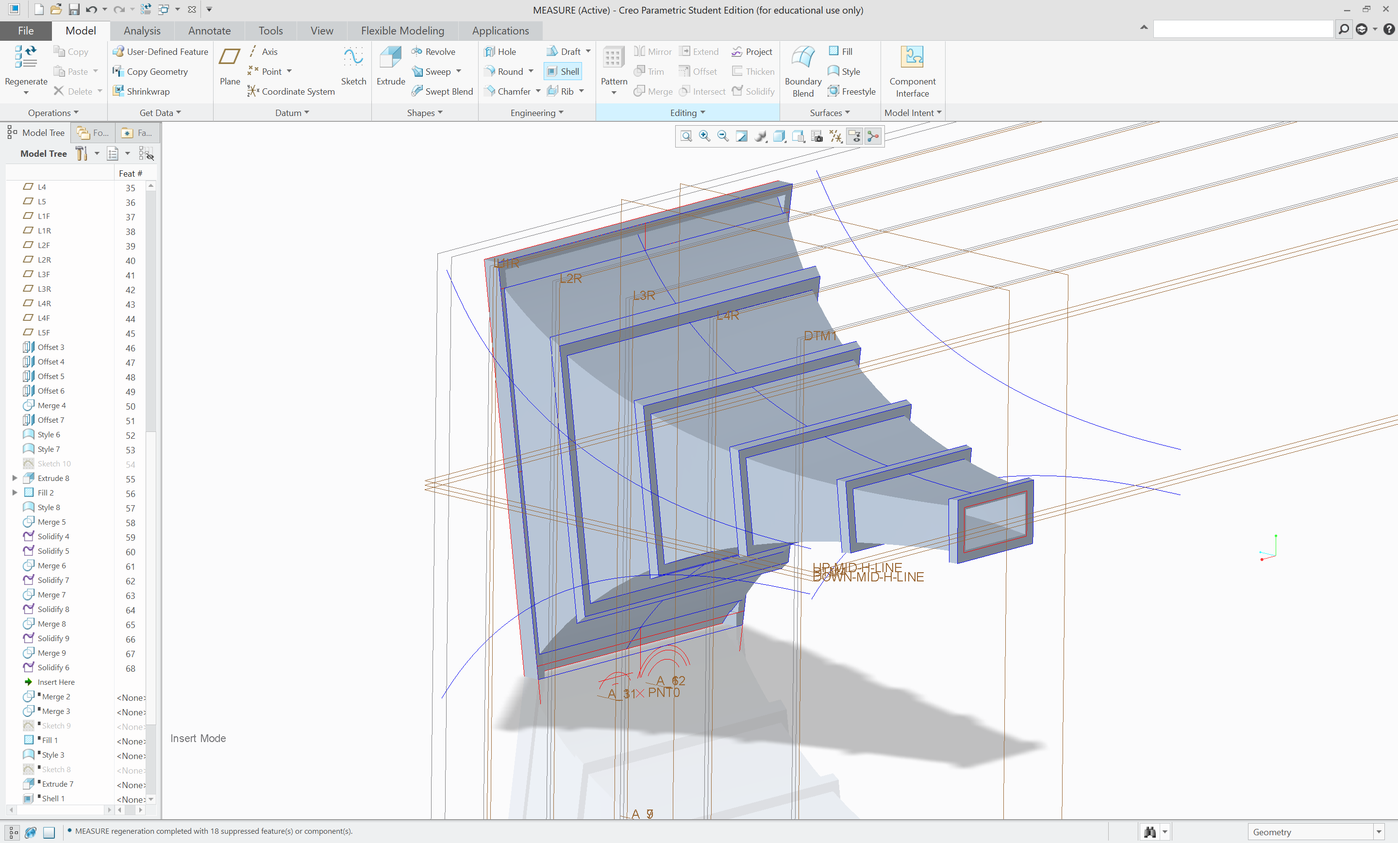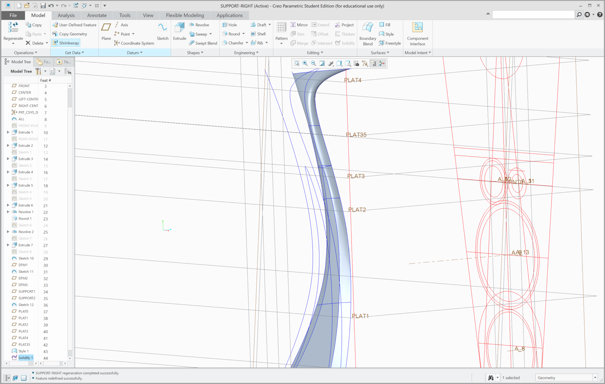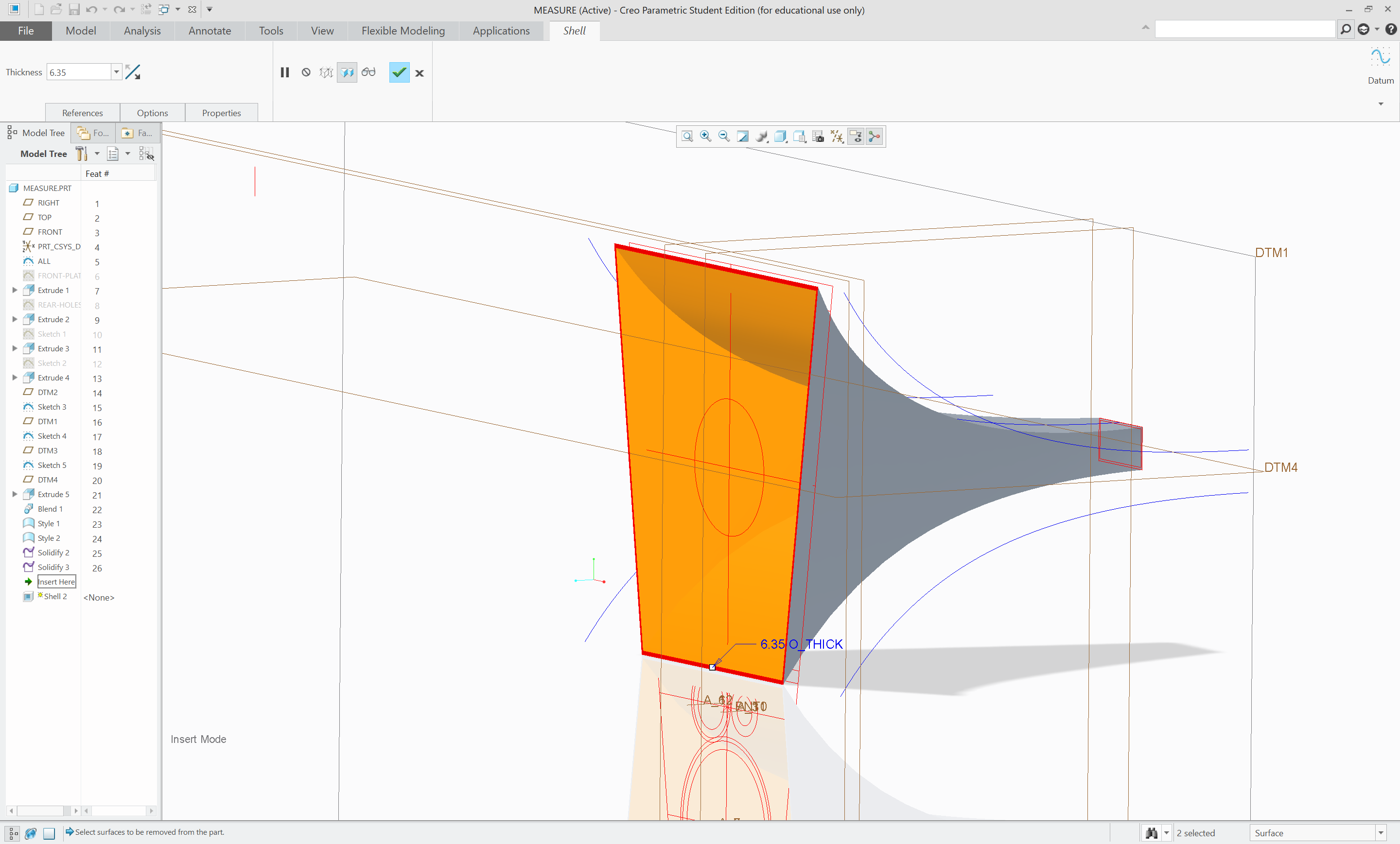 First, the overall shape was made using the blend, solidify with removal and shell functions in Creo. Then, the stabilizing structures were modeled by offsetting and joining surfaces, creating extra datum planes, projecting curves down to the inner shell and creating surfaces joining the structure.